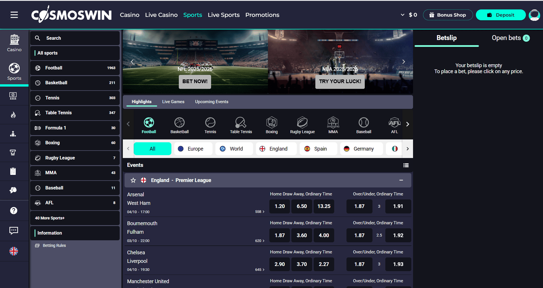 بالنسبة لأولئك المهتمين بالجمع بين الكازينو المباشر والمراهنات الرياضية في كوزموسوين، يمكنك التبديل بسهولة بين ألعاب الكازينو والمراهنات الرياضية من نفس الحساب. يعمل رصيد العملات الرقمية الخاص بك لكليهما، ولا حاجة لتحويل الأموال بين الأقسام.