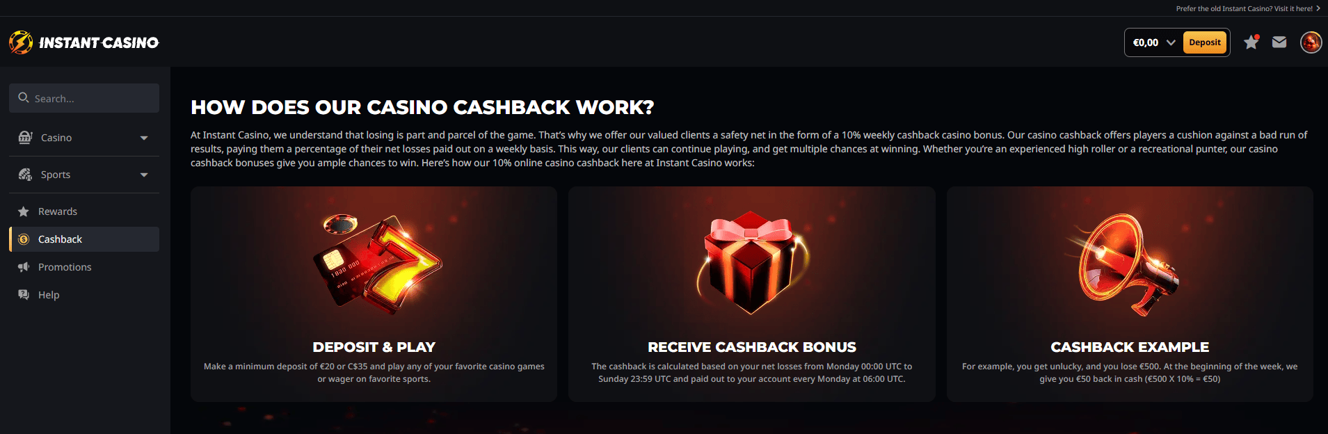 يُعد استرداد النقود الأسبوعي بنسبة 10% في كازينو إنستانت دبي من أبسط المكافآت التي ستجدها. كل اثنين الساعة 6:00 صباحًا بتوقيت غرينتش، يمكنك استرداد 10% من صافي خسائرك من الأسبوع السابق. الحد الأدنى للاسترداد النقدي هو 0.37 درهم إماراتي، والحد الأقصى 36,700 درهم إماراتي أسبوعيًا. لا توجد متطلبات رهان، ما يعني أنه يمكنك سحب المبلغ فورًا أو استخدامه للعب. إذا تجاوزت قيمة الاسترداد النقدي 36,700 درهم إماراتي، فسيتواصل معك أحد مديري كبار الشخصيات شخصيًا.