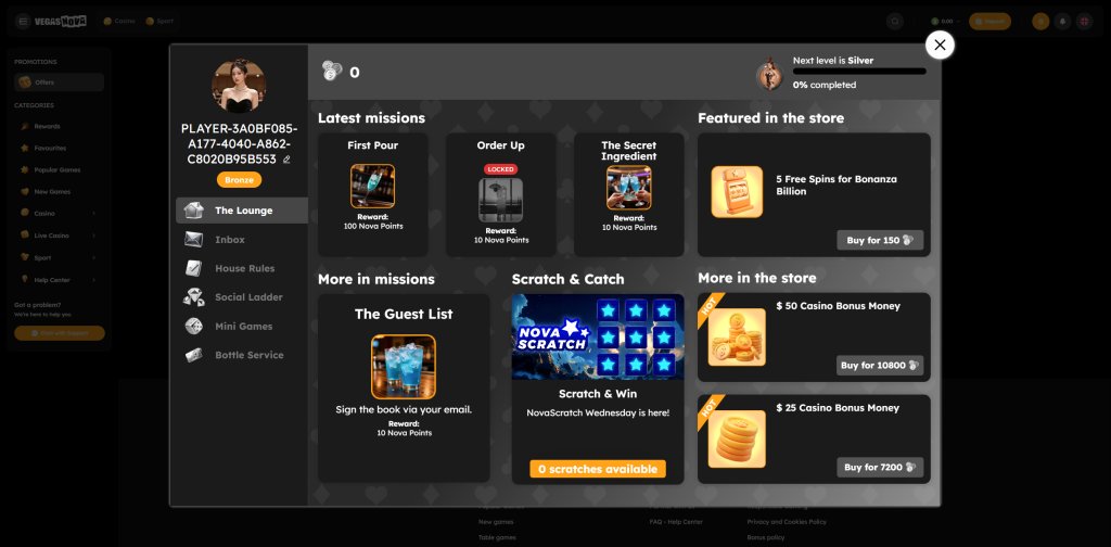 يمتلك VegasNova نظام مكافآت داخلياً يعمل بالتوازي مع العروض الترويجية العادية. تجمع نقاط Nova من خلال اللعب والإيداع، ثم تنفقها في متجر الكازينو على free spins أو أموال مكافأة. الفكرة بسيطة: كلما لعبت أكثر، كسبت أكثر، واسترددت ما تريد.